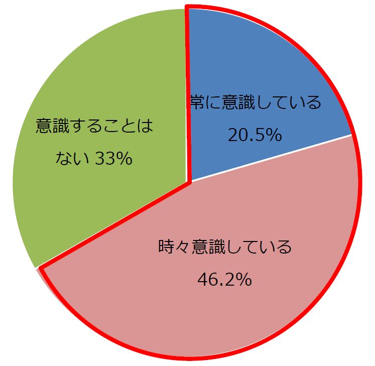 「企業理念を知らない」、「企業理念がない」と回答した方を除く346名のビジネスパーソンを対象に、日々の業務の中で企業理念を意識しながら働いているか聞いたところ、「常に意識している(20.5%)」、「時々意識している(46.2%)」と合わせて66.7%のビジネスパーソンは、日々の業務中も企業理念を意識しながら働いていることが分かりました。