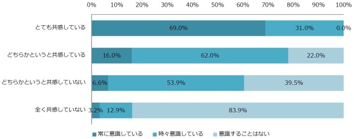 また、自社の企業理念に対しての共感度合いを参考に比較してみると、自社の企業理念に「共感している」ビジネスパーソンほど、日々の業務中も企業理念を意識しながら働いていることが分かりました。