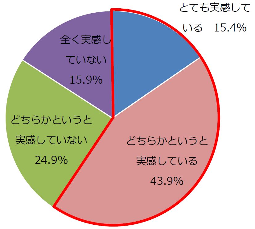 自らの仕事が世の中の役に立っていると実感しているか聞いたところ、「とても実感している(15.4%)」、「どちらかというと実感している(43.9%)」と合わせて59.3%のビジネスパーソンは、自らの仕事が世の中の役に立っていると実感していることが分かりました。