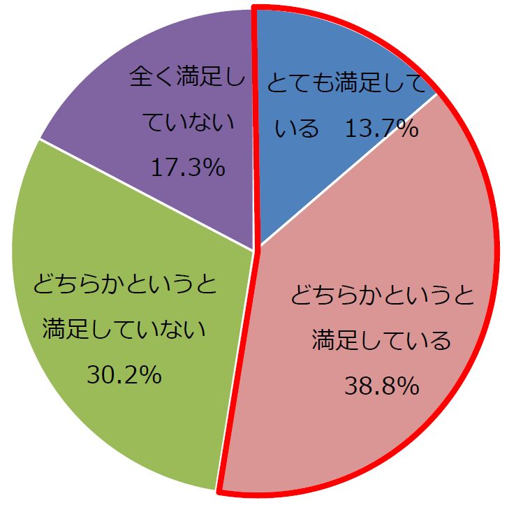 次に、現在所属している会社に満足しているかを聞いたところ、「とても満足している(13.7%)」、「どちらかというと満足している(38.8%)」と合わせて52.5%、ビジネスパーソンの2人に1人が所属している会社に満足していることが分かりました。