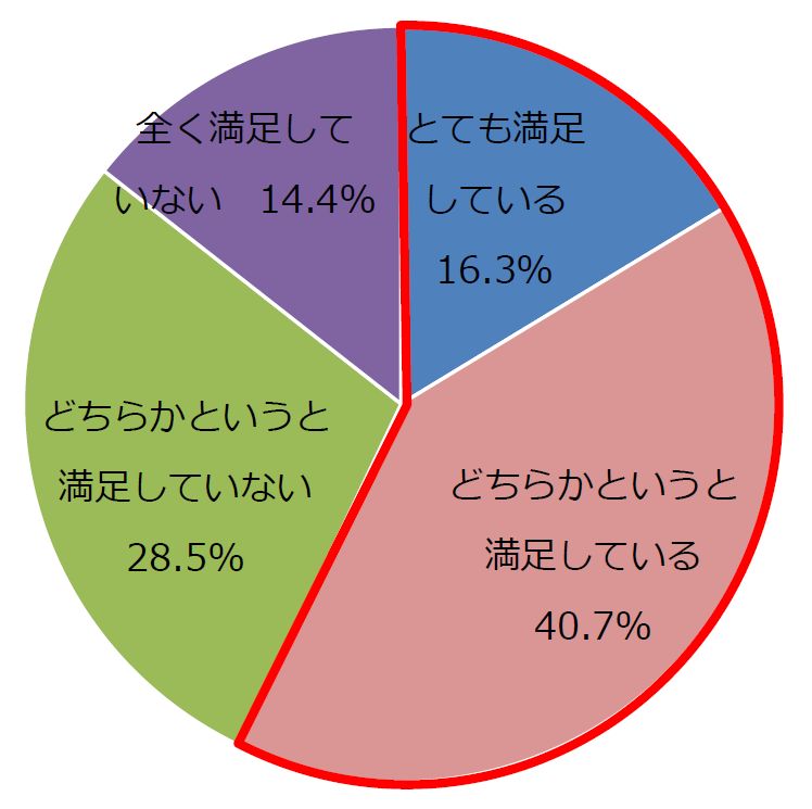 現在の業務内容に満足しているかを聞いたところ、「とても満足している(16.3%)」、「どちらかというと満足している(40.7%)」と合わせて57.0%のビジネスパーソンが現在の業務内容に満足していることが分かりました。