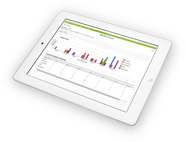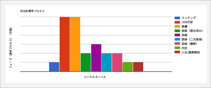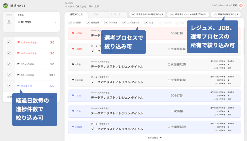 HRビジネスクラウドには、案件の進捗や停滞が一目でわかる「進捗NAVI」や、求職者の選考プロセスを管理する「選考プロセス管理」、データを分析・可視化し業務フローの課題を特定し、改善することができる「レポート&ダッシュボード機能」など各種KPIマネジメントをサポートする強力な機能が備わっています。