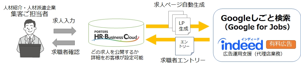人材ビジネスの業務最適化をクラウドサービスでサポートするポーターズ株式会社(本社:東京都港区、代表:西森 康二)は、人材ビジネス企業の国内導入実績1,500社の『PORTERS HRビジネスクラウド(以下HRBC)』とIndeedとの自動連携によるIndeed有料広告運用サービスを2018年9月に開始しましたが、この度、同サービスにおいて「Google しごと検索(Google for Jobs)」への対応を2019年2月に完了します。