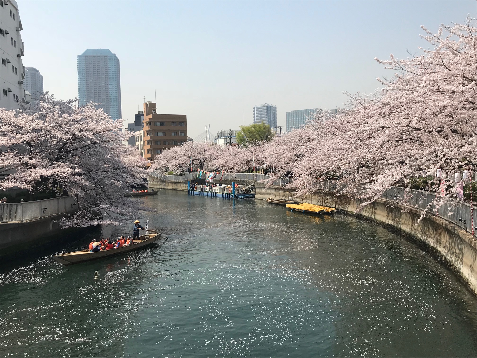 大横川の桜並木は、枝が水面近くまで低くせり出しているのが特徴で、和船や動力船から見上げる一面の桜は、まるで江戸の時代へタイムスリップしたかのような気分にさせてくれます。