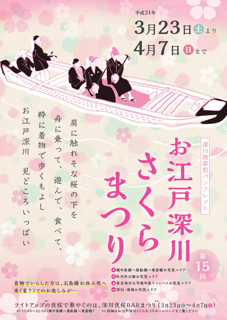 2019年3月23日(土)より、江東区深川エリアにて「第15回 お江戸深川さくらまつり」が開催されます。今年もお花見和船が運行されるほか、朝市やガムラン演奏、木のまち深川を家族で楽しめるワークショップイベント「The 深川 WOOD FES」など様々なイベントを開催いたします。