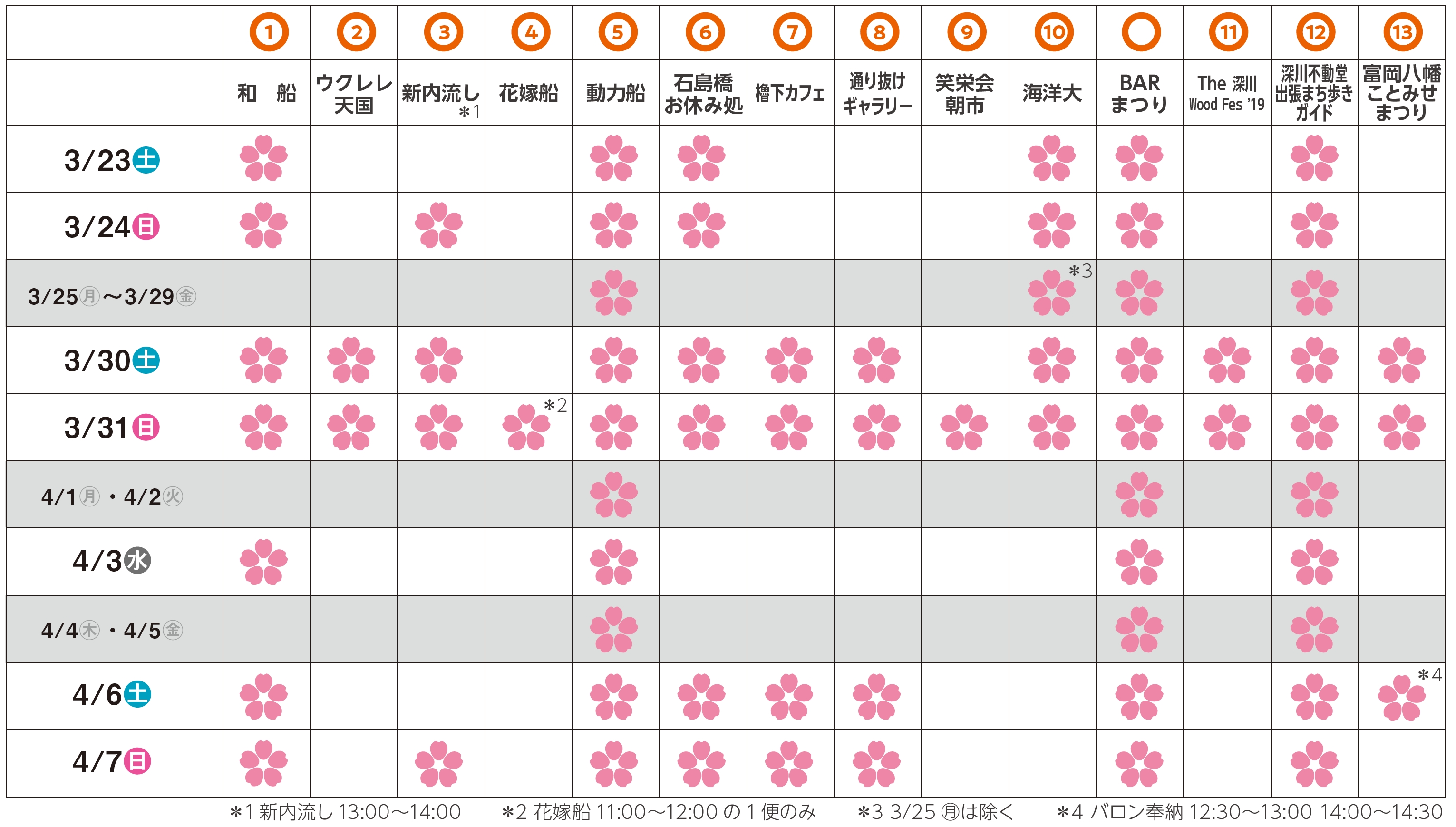 ■お花見クルーズ船【動力船】(大横川周遊+隅田川ミニクルーズ付き):まつり期間中は毎日運行(約1時間おき)