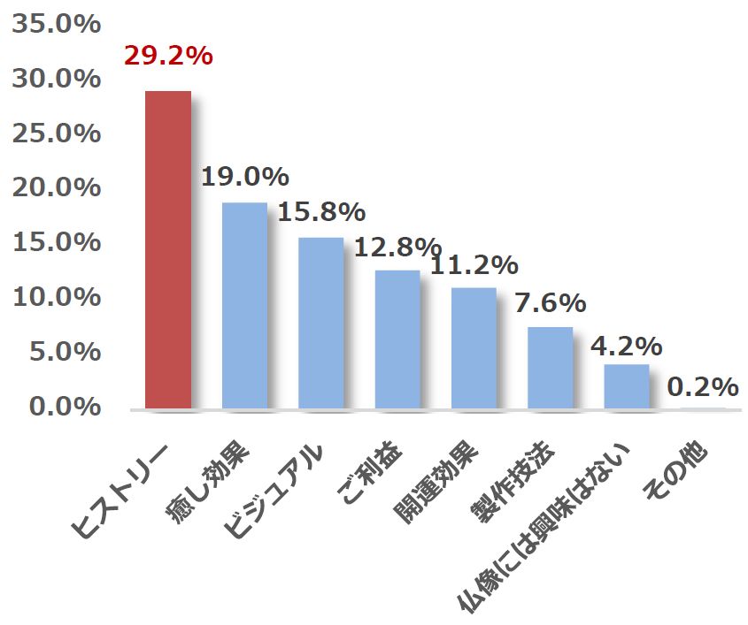 仏像のどのようなことに対して最も興味があるのかを聞いたところ、最も多かったのが「ヒストリー(29.2%)」、次に「癒やし効果(19.0%)」、「ビジュアル(15.8%)」という結果になりました。