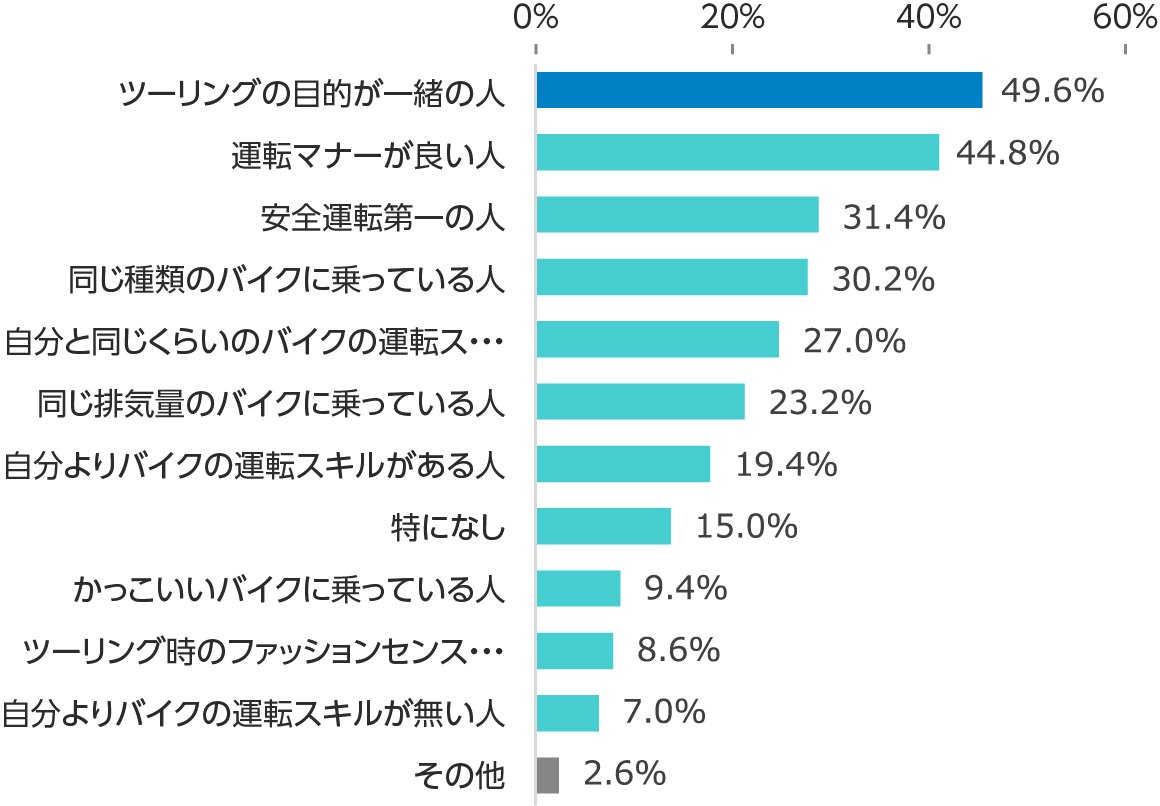 ツーリング時の理想のパートナーランキング第1位は「ツーリングの目的が一緒の人(49.6%)」