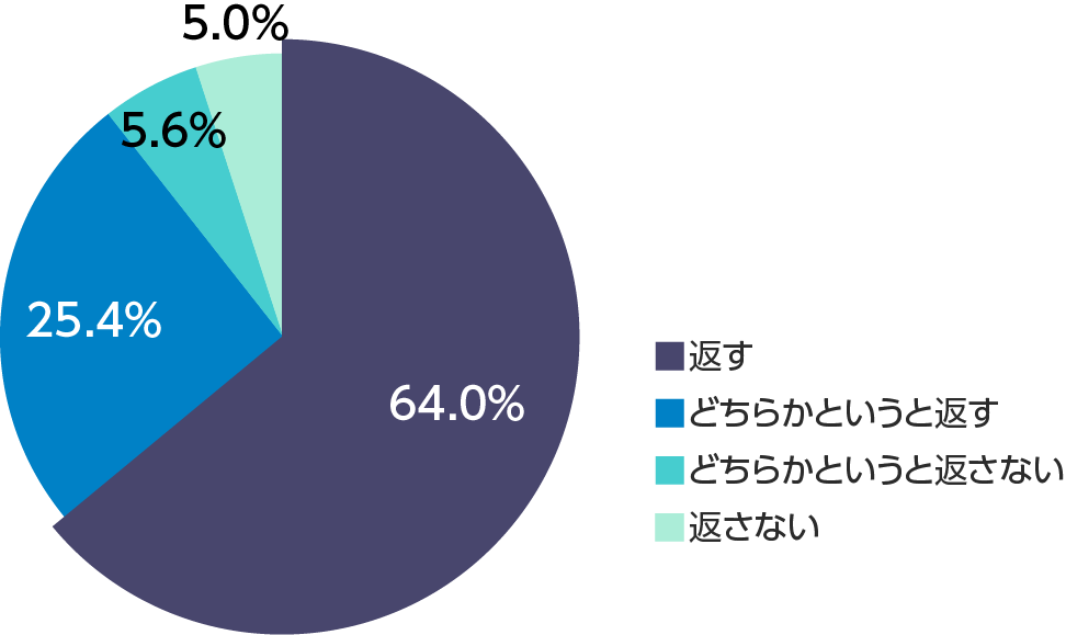 また、走行中に「ヤエー」された場合、返事を返すか聞いたところ、「返す(64.0%)」、「どちらかというと返す(25.4%)」と合わせて89.4%、約9割のライダーが「ヤエー」に対して返事を返していることがわかりました。これらの結果から、ヤエーはライダー間での独自のコミュニケーションとして、一般認識されているということがわかりました。