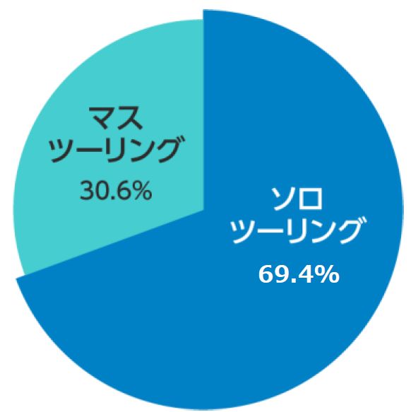 ソロツーリング(1人)とマスツーリング(複数人)のどちらを好むか聞いたところ、ソロツーリングと回答したライダーは69.4%、マスツーリングと回答したライダーは30.6%と、約7割のライダーがツーリングは1人で走る方が好きだということが分かりました。