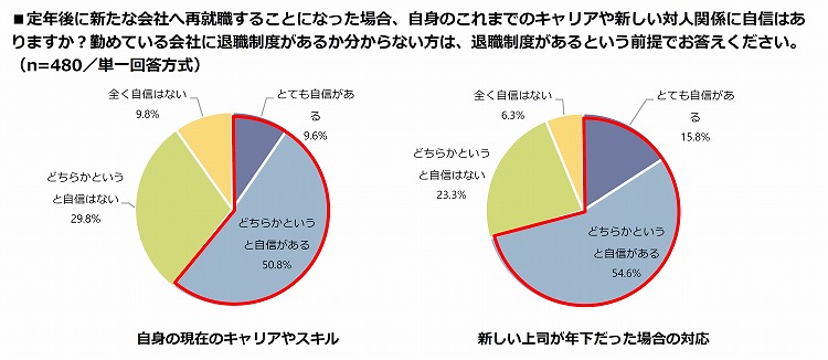 自身が勤める会社に定年制度がないと回答した20名を除く男性480名を対象に、定年後に新たな会社へ再就職することになった場合、自身のこれまでのキャリアやスキルに自信があるかを聞いたところ、「とても自信がある(9.6%)」と「どちらかというと自信がある(50.8%)」合わせて60.4%の方が自信を持っていることが分かりました。また、再就職の際の人間関係で問題となる「年下上司への対応」にも、7割近くが自信があると回答しました。