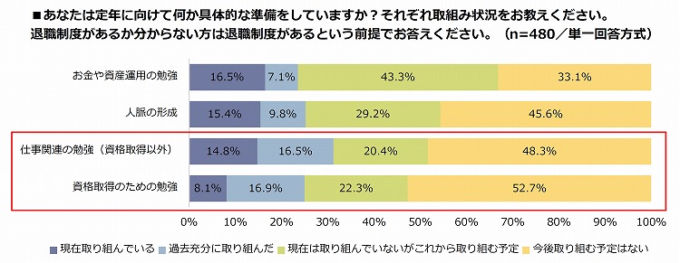 今回の調査では、定年退職後のお金や暮らしへの不安は大きく感じている反面、自身のキャリアやスキルには自信を持っているという方が比較的多いことが分かりました。また定年退職に向けた準備としては、資産運用などを考えている方が多く、仕事関連の勉強をしている方が比較的少ない結果となりました。