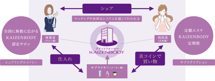 「KAIZEN BODY」では、お客様・サロン店・コスメメーカーの3者をWEB上で繋げる新しい形のプラットホームで、従来コストと手間がかかっていた集客や予約対応、店舗の備品購入といったサロン経営の煩雑な手間を全てWEB上でプラットホームとしてご提供します。
