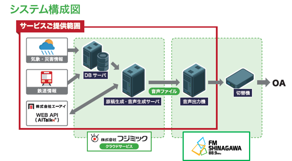 この度フジミックの「DERTA」には、エーアイのクラウドサービス「AICloud(R)」の音声合成API「AITalk(R) WebAPI」が連携されています。クラウドサーバで集約された気象情報、鉄道情報、地震・台風などの情報を、フジミックが開発した自動原稿生成技術で放送に適した原稿を生成し、原稿を「AITalk(R) WebAPI」で音声合成することで、原稿生成から放送までの自動化を実現しています。