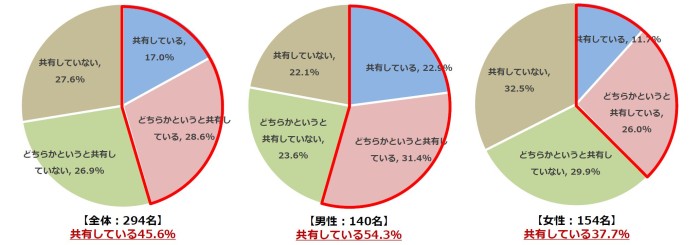 次に、聴力の低下を感じると回答したシニア(60歳以上)294名を対象に、聴力の弱まりを家族と共有しているか聞いたところ、「共有している(17.0%)」、「どちらかというと共有している(28.6%)」と合わせて45.6%の方が聴力の弱まりを共有していることが分かりました。また、男女別で比較してみると、聴力の弱まりを家族と共有している男性は54.3%、女性は37.7%と男女間では16.6%の差があることが分かりました。