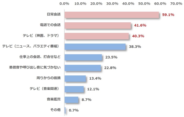 音が聞こえにくいことでストレスを感じると回答したシニア(60歳以上)149名を対象に、どのようなことに対してストレスを感じるか聞いたところ、聴力低下によるストレス第1位は「日常会話(59.1%)」、第2位は「電話での会話(41.6%)」、第3位は「テレビ(映画、ドラマ)(40.3%)」という結果になりました。