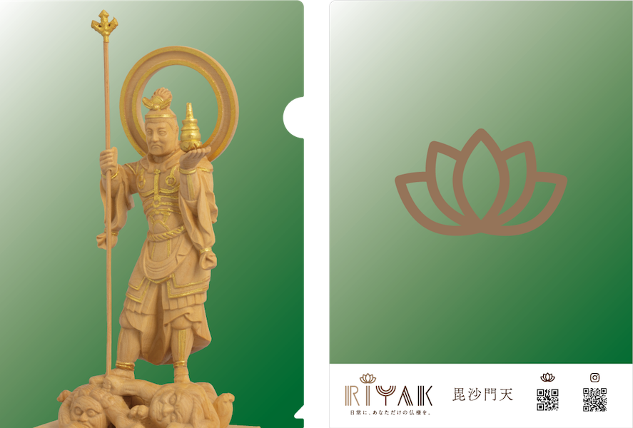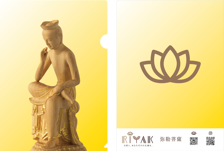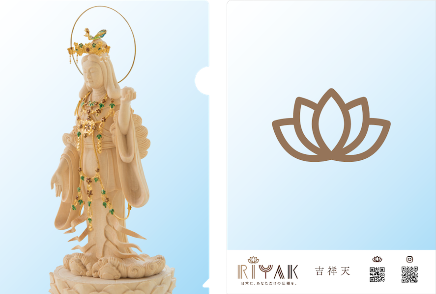 「日常に、あなただけの仏様を。」をコンセプトとした、国内初の木製インテリア仏像ブランド「RIYAK」(https://www.riyak.jp/ )。その中でも、特に人気があるインテリア仏像4種(吉祥天、弥勒菩薩、座不動明王、毘沙門天)をクリアファイルにいたしました。和紙調のクリアファイルは、触り心地も良く、心に落ち着きを与えてくれます。仏像が持つ癒し効果を感じながら、ビジネスシーンなどでご活用ください。本商品は、RIYAK取扱店舗、または、2019年8月22日(木)から東急ハンズ新宿店で開催される「ハンズメッセ」にてご購入可能です。