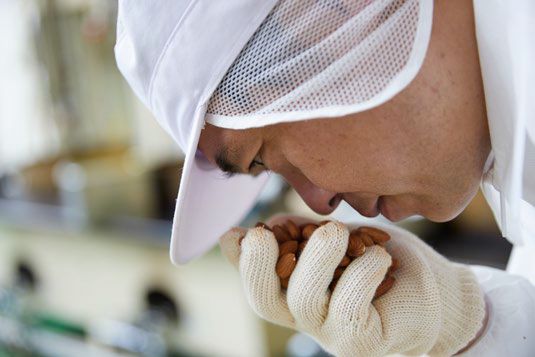 素材は、ひとつひとつ全てにこだわっています。特に大切にしているのは、メインとなるアーモンドの風味。何社からも取り寄せてもっとも良いものを、現場の職人とも食べ比べながら選んでいます。現場では、毎日、アーモンドを食べて状態をチェックしています。