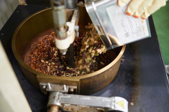 また、最初から素材全部を入れてしまうと、どの素材も水飴まみれで食感がガチガチに固くなってしまいます。最高の美味しさをつくるため、投入タイミングは1秒単位で管理しています。アーモンドバーの風味を生かす上で、もっともこだわっている作業です。