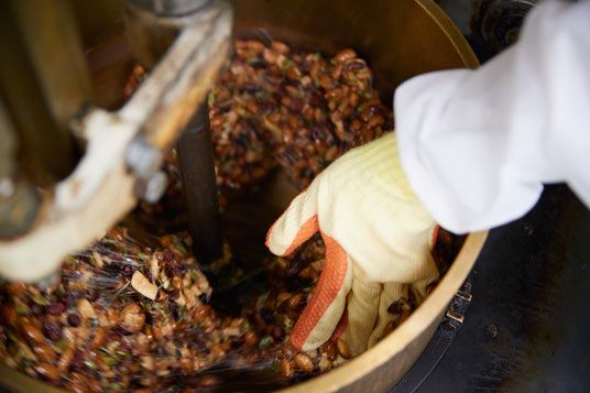 混ぜ合わせた後、アツアツの釜に手を入れて水飴とアーモンドの絡み具合の仕上げをします。機械だけに頼ってしまうとまざりが不揃いになってしまうので、そうならないように手で補助をします。