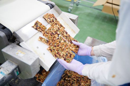 『TEMAHIMAN』のアーモンドバーの大きな特徴は、長さが8cmと長いこと。ただ、長い分、商品が傷つくし欠けやすいという課題も。そうならないよう、ここでも一人の職人が“手で受けとめる”作業をしています。