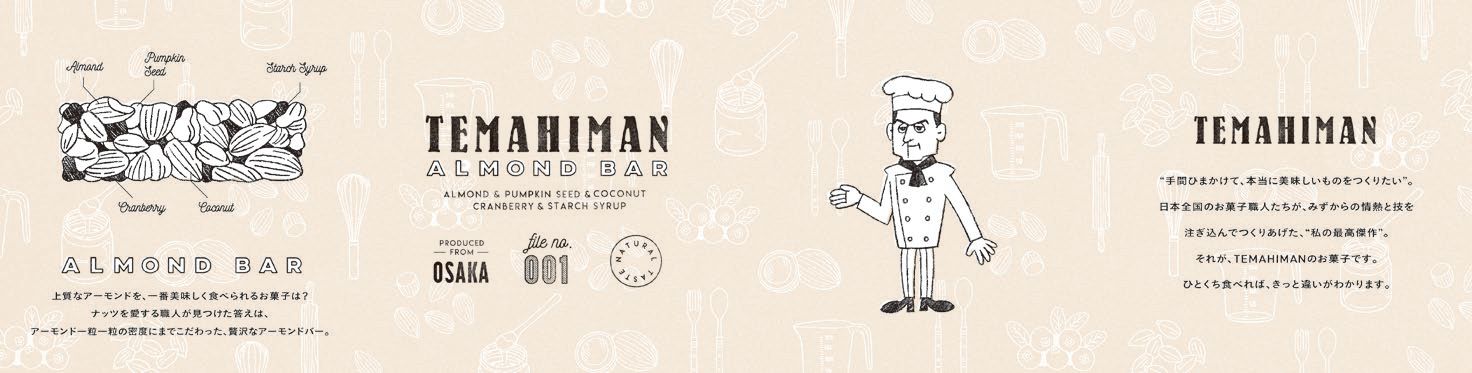 「原価を気にせず、手間暇かけて、本当においしいお菓子をつくりたい。」そんな想いを持つお菓子職人たちが、みずからの情熱と技を注ぎ込んでつくりあげた「自分史上最高傑作」。それがTEMAHIMANブランドのお菓子です。第1弾は、ナッツを愛する職人が、上質なアーモンドを一番おいしく食べてもらうために作った贅沢なアーモンドバー。ひとくち食べれば、これまでのアーモンドバーとの違いが分かります。これからの季節、帰省や観光のお土産にお勧めの商品です。当商品は近畿エリアを中心としたお土産店にて購入が出来ます。