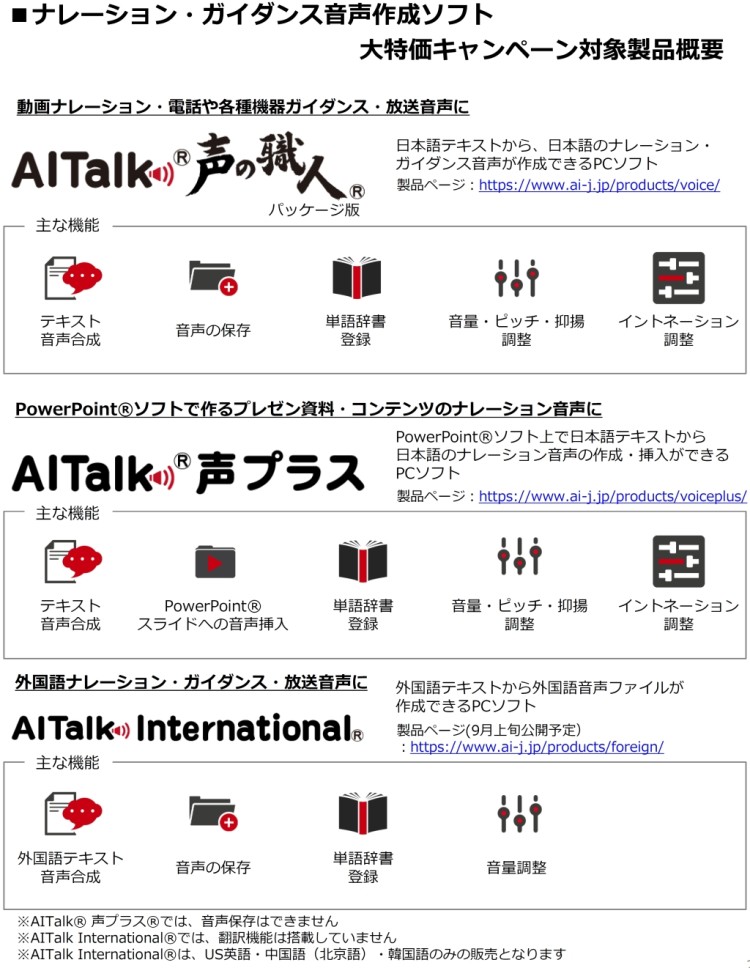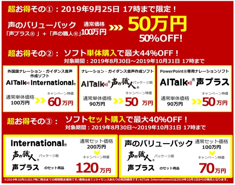 株式会社エーアイ(本社:東京都文京区、代表取締役:吉田 大介、証券コード:4388、以下エーアイ)は、2019年8月30日(金)から2019年10月31日(木)の間、高品質音声合成エンジンAITalk(R)を利用したナレーション・ガイダンス音声作成ソフト「AITalk(R) 声の職人(R) パッケージ版」、PowerPoint専用ナレーション作成ソフト「AITalk(R) 声プラス(R) 」、2019年10月1日よりリニューアル販売を開始する外国語ナレーション作成ソフト「AITalk International(R)」の大特価キャンペーンを実施することをお知らせします。
