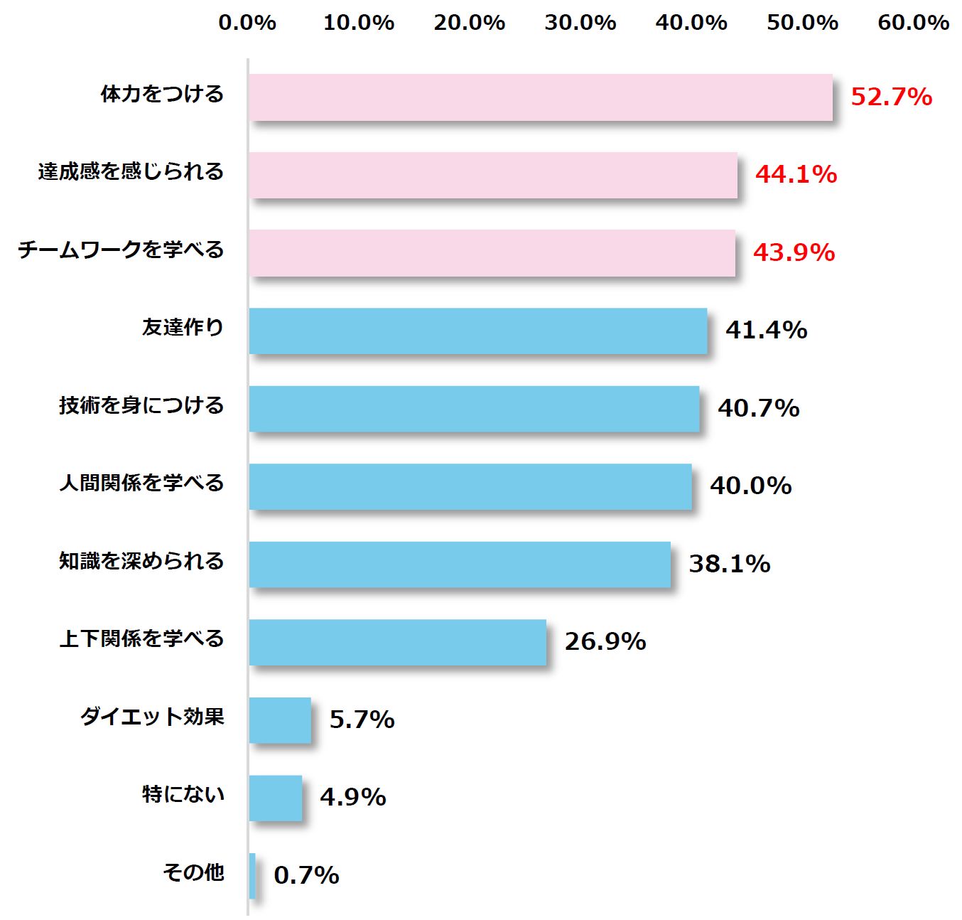 部活や習い事をしている小学4年生から中学3年生までのお子さまを持つ保護者男女700名を対象に、「部活、習い事」のメリットは何か聞いたところ、最多回答は「体力をつける(52.7%)」で、半数以上の保護者が「部活、習い事」のメリットと感じていることが分かりました。次に「達成感を感じられる(44.1%)」、「チームワークを学べる(43.9%)」と続きました。
