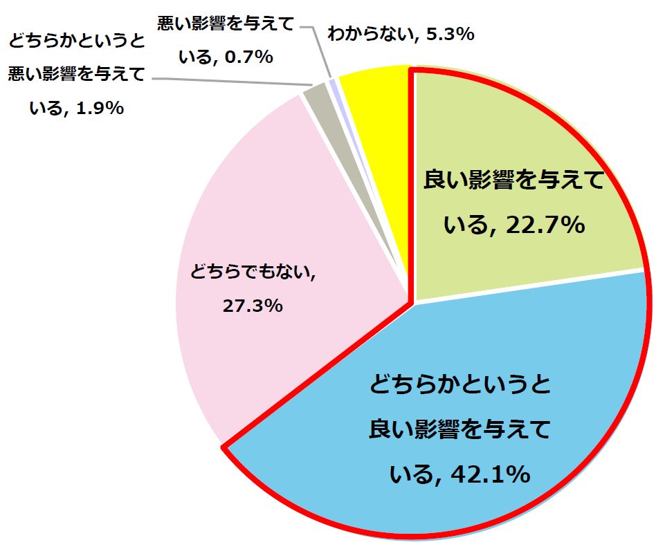 自身の子どもに対して、「部活、習い事」の友人がどのような影響を与えると思うか聞いたところ、「良い影響を与えている(22.7%)」、「どちらかというと良い影響を与えている(42.1%)」と合わせると64.8%、保護者の6割以上が「部活、習い事」の友人から良い影響を受けていると感じていることが分かりました。