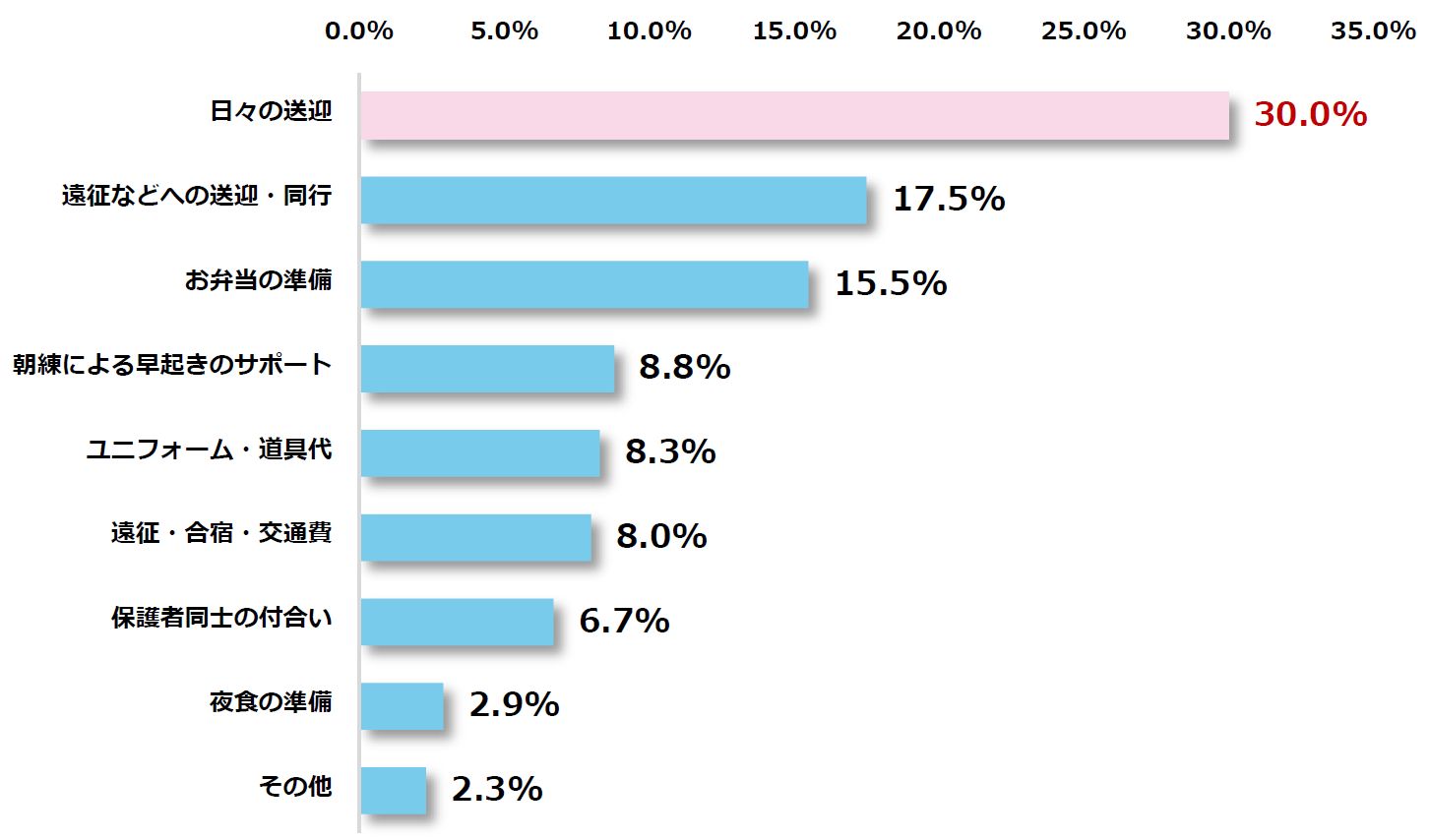 小中学生の「部活、習い事」サポートを大変に感じている保護者490名を対象に、一番大変に感じることは何か聞いたところ、最多回答は「日々の送迎(30.0%)」、次に「遠征などへの送迎・同行(17.5%)」、「お弁当の準備(15.5%)」と続きました。