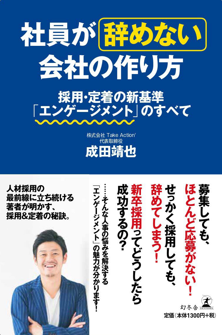 また、当社代表の成田 靖也が採用・定着の新基準である「従業員のエンゲージメント」について解説した書籍「社員が辞めない会社の作り方 採用・定着の新基準『エンゲージメントのすべて』」が、2019年10月10日に幻冬舎より発売となりました。