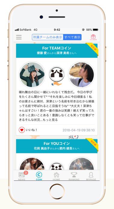 Web上で、ユーザー同士が感謝の気持ちを理念に落とし込んだ独自のコインに替えて贈り合い、組織内のコミュニケーションを活性化させる社内SNSサービスです。
