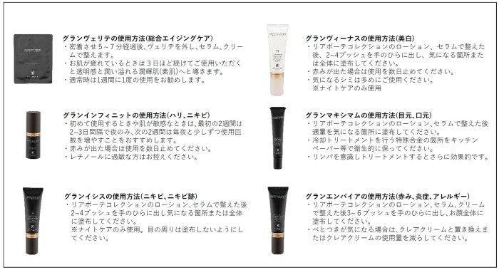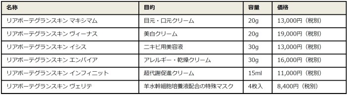 「リアボーテコレクション」グランシリーズは、独自の有用成分『不死の花幹細胞LPS(※1)』を配合した、ヒト幹細胞培養液配合のクリニック・サロン専売品のスキンケアシリーズです。業界最多レベルの幹細胞由来成分の配合数を誇り、その高い美容効果から全国のクリニックやエステサロンを始めとする2,500店舗以上に導入いただいており、業界でも異例のロングセラーとなっています。この度、新発売する「リアボーテグランスキン」は、リアボーテシリーズ最上級の位置づけとなるもので、従来の独自培養の幹細胞由来成分に加え、今大注目のヒト幹細胞培養液を採取する細胞別に7種(表皮、真皮、骨髄、神経、臍帯血、羊水、脂肪)、また植物の幹細胞由来成分を10種以上を配合した次世代の幹細胞スキンケアです。目元・口元クリームの「リアボーテグランスキンマキシマム」や、ニキビ用美容液の「リアボーテグランスキンイシス」など目的別に6種をご用意いたしました。