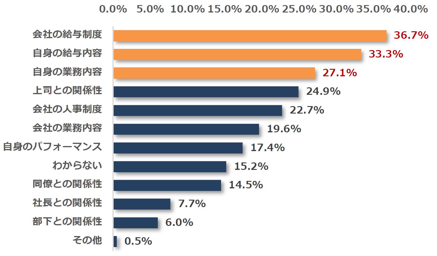 第1位「会社の給与制度」、第2位「自身の給与内容」第3位「自身の業務内容」