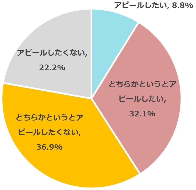 最後に、自身が承認されたことを周りに伝えたいと思うか質問したところ、「アピールしたい(8.8%)」、「どちらかというとアピールしたい(32.1%)」と合わせると40.9%のビジネスパーソンが自身が承認されたことをアピールしたいと感じていることが分かりました。