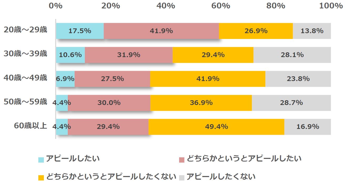 また、年代別に比較してみると、自身が承認されたことをアピールしたいと感じているビジネスパーソンは、20代が最多で59.4%、30代が42.5%、40代が34.4%、50代が34.4%、60代が33.8%という結果になりました。年齢と共にビジネスパーソンの承認欲求は減少傾向にあることが分かりました。