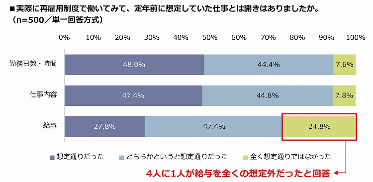 定年前に想定していた仕事内容と再雇用後の実際の仕事に開きがあったかどうか聞いたところ、「勤務日数・時間」「仕事内容」共に9割以上が「想定通りだった」もしくは「どちらかというと想定通りだった」という回答だったのに対し、「給与」では想定通りは75.2%にとどまり、4人に1人の24.8%が「全く想定通りではなかった」と回答しました。