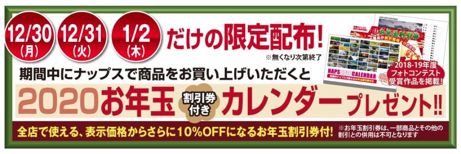 期間中にナップスで商品をご購入いただくと、表示価格からさらに10%割引となるお年玉割引券が付いた「2020 お年玉割引券付カレンダー」をプレゼントいたします。