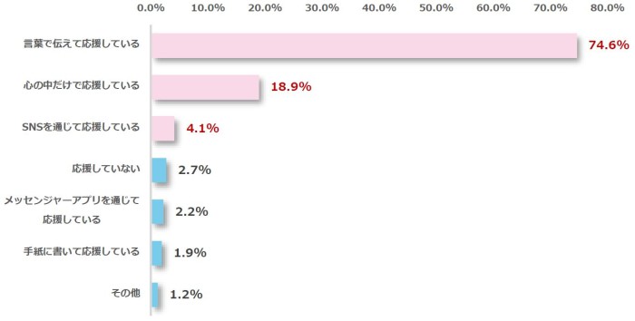 次に、受験生の子どもに対しどのように応援をしているか質問したところ、最も多かったのが「言葉で伝えて応援している(74.6%)」、次に「心の中だけで応援している(18.9%)」、「SNSを通じて応援している(4.1%)」と続きました。