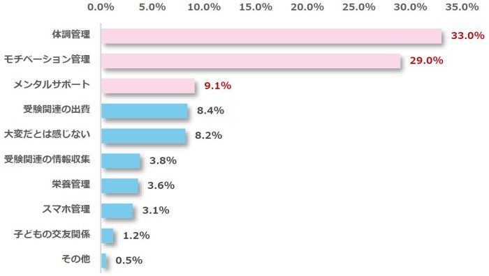 最後に、子どもの受験をサポートするにあたって、一番大変だと感じることは何かと伺ったところ、最も多かったのが「体調管理(33.0%)」、次に「モチベーション管理(29.0%)」、「メンタルサポート(9.1%)」と続きました。