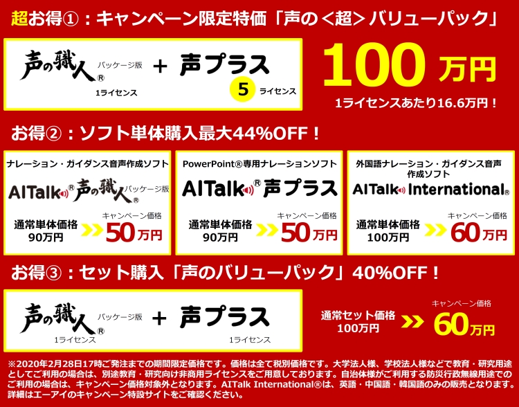 ※2020年2月28日17時ご発注までの期間限定価格です。価格は全て税別価格です。大学法人様、学校法人様などで教育・研究用途としてご利用の場合は、別途教育・研究向け非商用ライセンスをご用意しております。自治体様がご利用する防災行政無線用途でのご利用の場合は、キャンペーン価格対象外となります。AITalk International(R)は、英語・中国語・韓国語のみの販売となります。