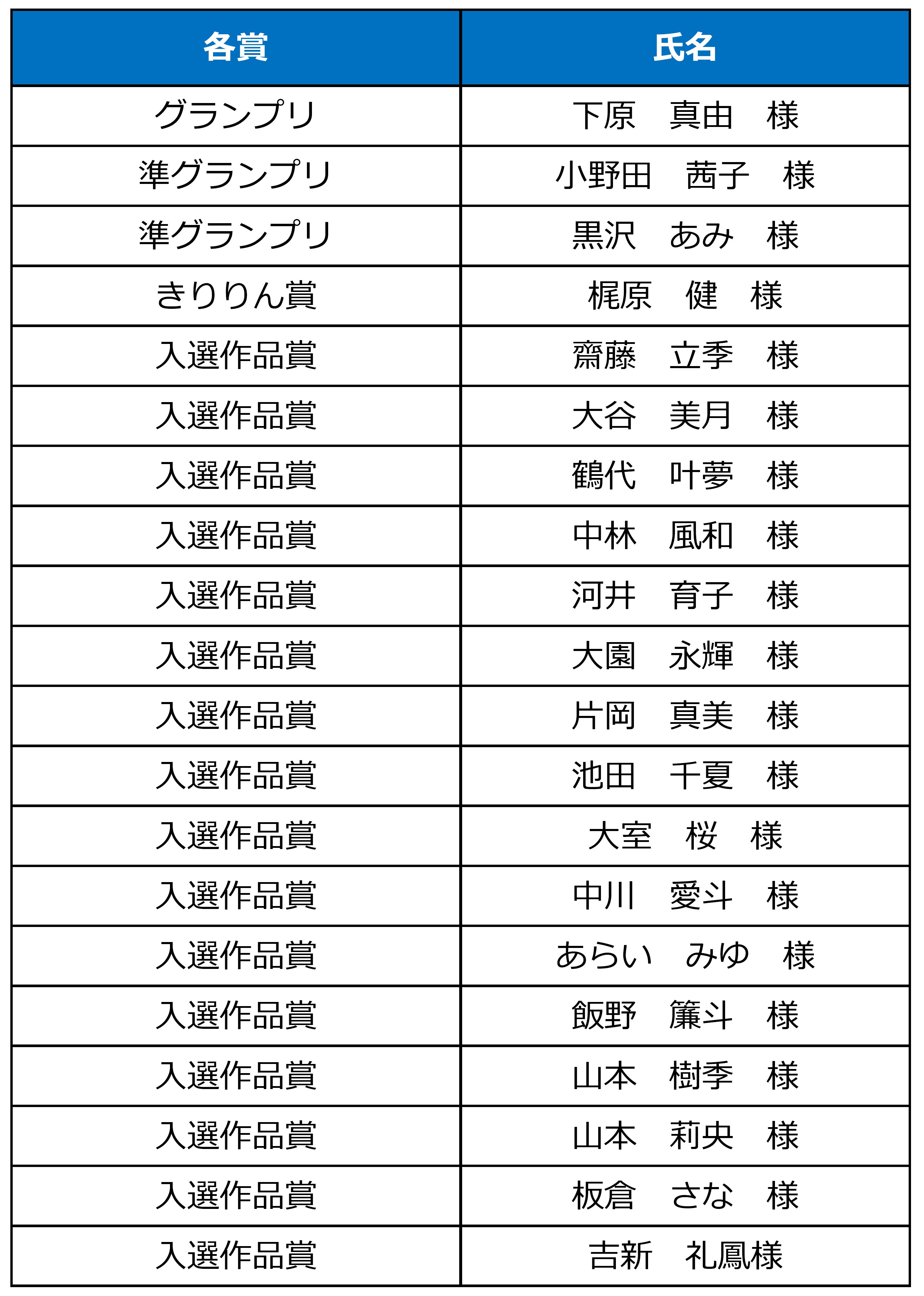 ・準グランプリ 2名(賞状、5,000円分カタログギフト)