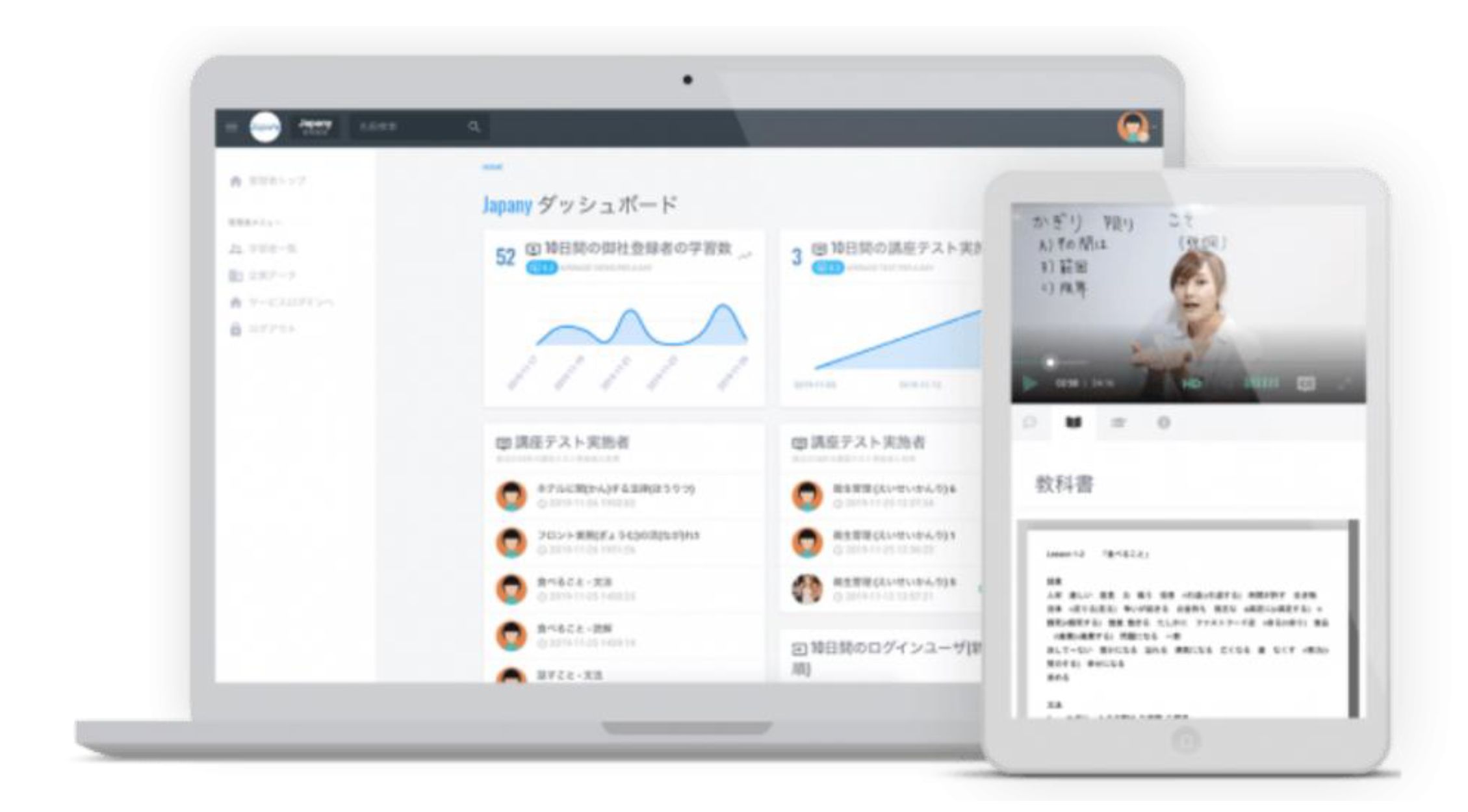 オンライン日本語学習教材「Japany Language」は、オンライン上で日本語教師の授業動画と教科書をスマートフォン・タブレットで視聴・閲覧することが可能です。