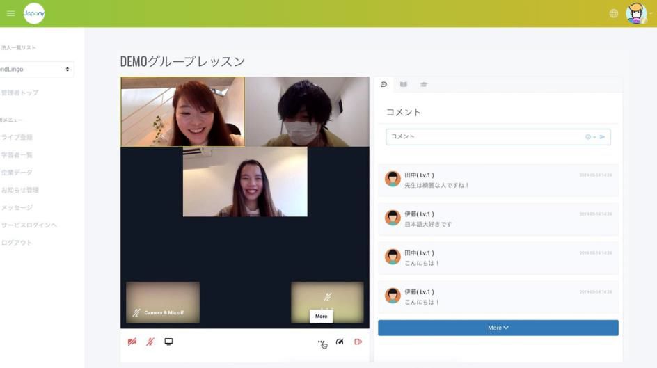 生活に関する日本語、ビジネス日本語、日本語検定試験対策など、500動画を超えるコンテンツをご用意。グループレッスン機能もあり、システム上でのライブ授業や学習カウンセリングの提供も可能です。