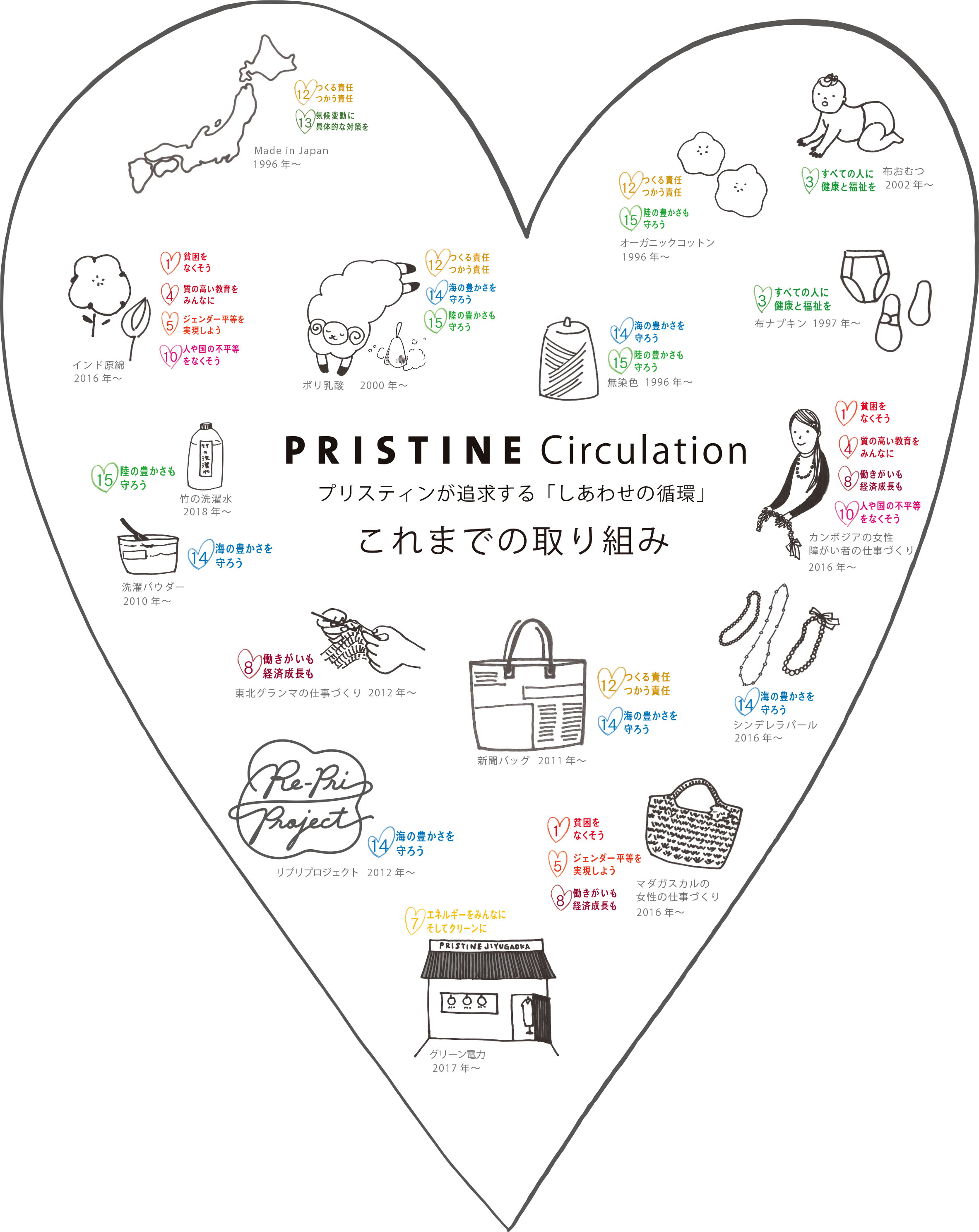 あたりまえに毎日着ている服が、自然にも着る人にも負荷をかけず、よい未来へつながるように、そんな想いから、プリスティンはデビュー以来、SDGsに沿ったものづくりを続けています。たっぷりの太陽の恵みを受けて育ったオーガニックコットンを使い、糸から生地、製品までをすべて日本でつくっています。