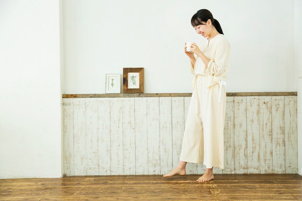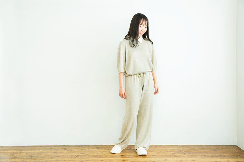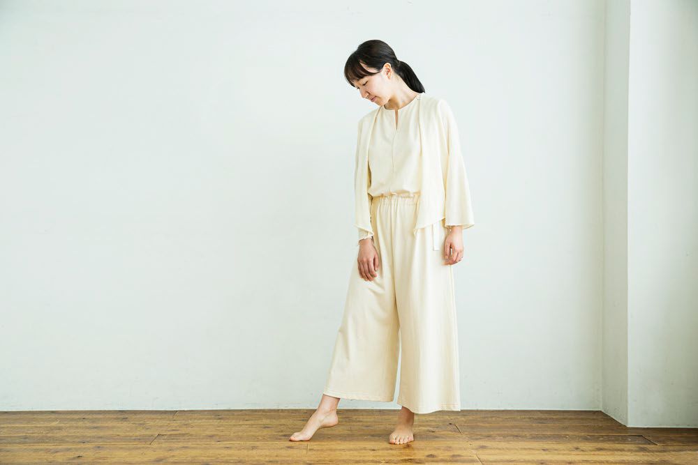 ボトムスには、プリスティン製品で人気のある、お肌側がコットン、表側がリネンコットンのカットソー素材を使用し、ゆったりとした履き心地を追求しました。裾をしぼり、動きやすさと安心感のある着心地にしました。