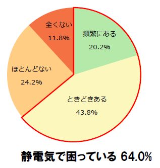 勤務中に静電気で困った経験を聞いたところ、64.0%の看護師が、勤務作業中の静電気に困っている実態が分かりました。