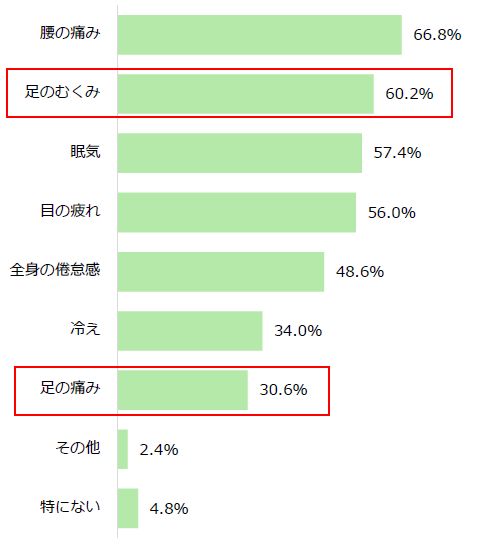 また半数以上が「足のむくみ(60.2%)」、「眠気(57.4%)」、「目の疲れ(56.0%)」に悩んでいる実態も分かりました。その他の自由回答としては、「肩こり」や「頭痛」という回答もみられました。