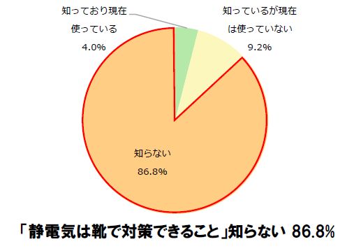 一方で、ナースシューズなど靴を変えることで静電気対策がある程度できることを知っているかを聞いたところ、「知っており現在使っている」はわずか4.0%で、86.8%の看護師がそうした対策シューズがあることを知らないという状況が分かりました。