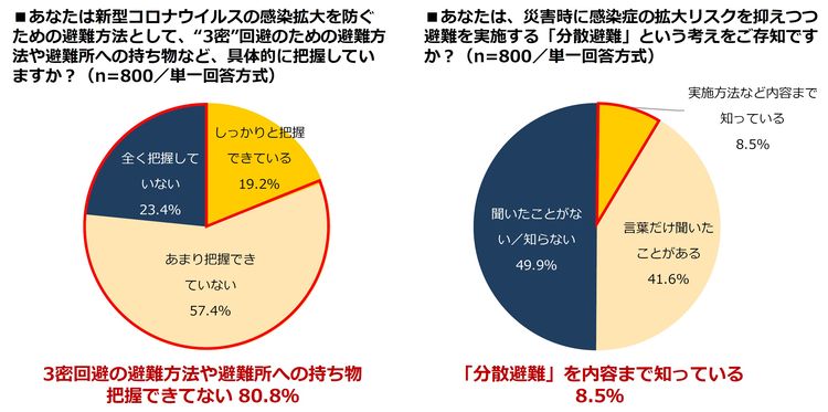 また、災害時に避難所などに人が密集すると新型コロナウイルスに感染するリスクがあることから、避難所以外の避難先として「親戚・知人宅」「ホテル」「在宅避難」「車中泊」など、様々な避難先に分散して避難することが推奨されています。こうした避難方法である「分散避難」という考えを知っているか聞いたところ、「実施方法など内容まで知っている」と回答した方は8.5%にとどまり、「言葉だけ聞いたことがある」 が41.6%となり、 「聞いたことがない/知らない」という方はほぼ半数の49.9%に上りました。